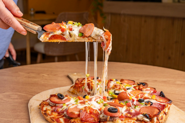 light pizza sauce, beef, mortadella, beef hot dog, mushrooms, olives, bell